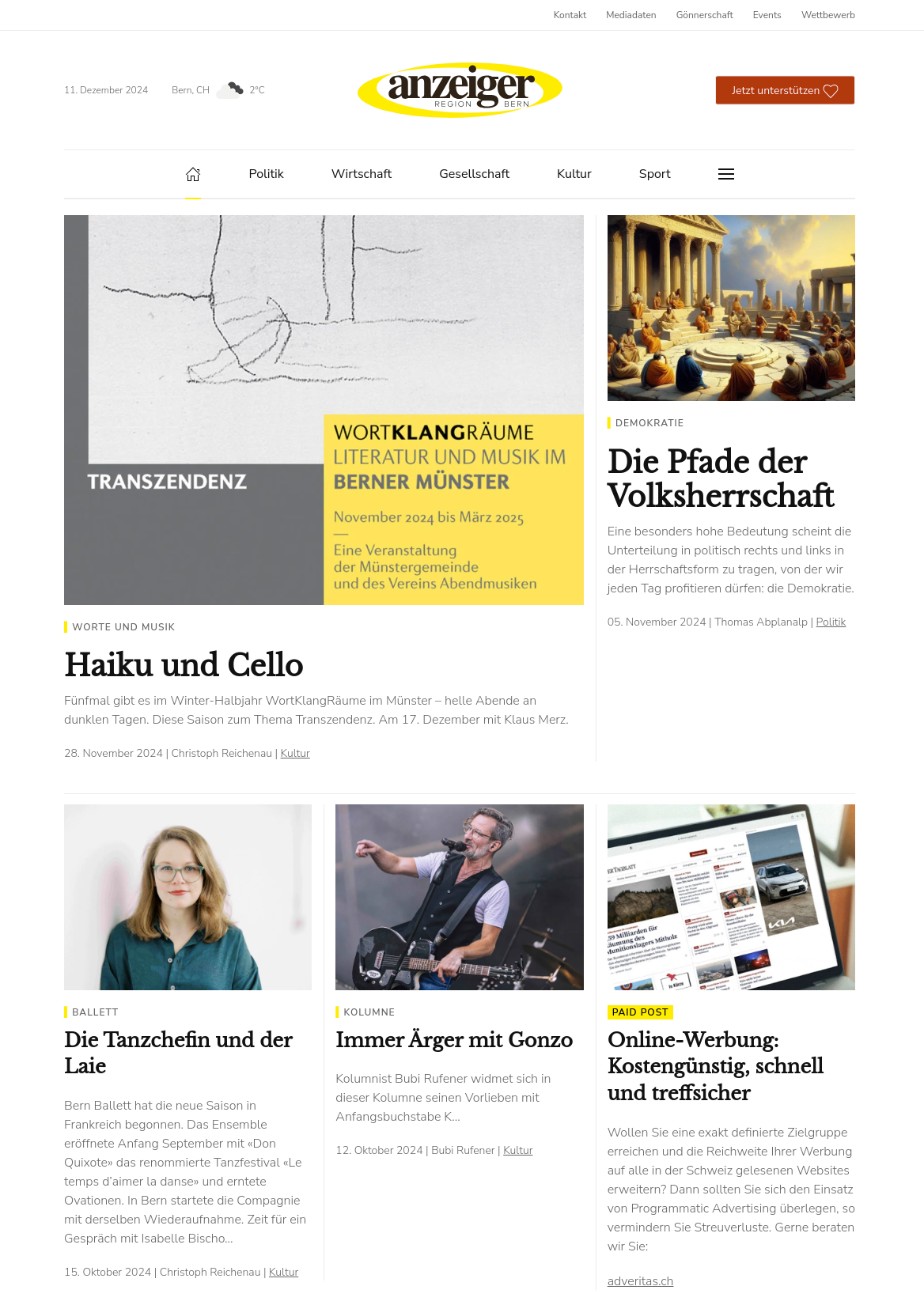 Der Anzeiger Region Bern ist eine unabhängiges Onlineportal für Stadt und Agglomeration Bern. Die traditionsreiche Marke steht für Seriosität und ist bei der Leserschaft fest verankert. Dank Themenvielfalt und objektiver Berichterstattung spricht er die gesamte Bevölkerung an und bietet so auch die ideale Plattform für deren Angebote.