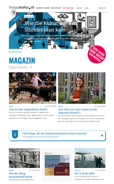 thurgaukultur.ch ist die Online-Kulturplattform für den Thurgau und die angrenzenden Regionen. Im Zentrum steht die Vermittlung und Einordnung der Kultur in all ihren Facetten. Im Magazin wird der Kulturjournalismus gross geschrieben und über Menschen und Hintergründe berichtet. Die Agenda bietet Orientierung und Inspiration – weit über die Kantonsgrenze hinaus. Das Angebot wird durch den Kulturplatz ergänzt – ein Panoptikum, das die Kulturszene und ihre Akteur:innen in den Mittelpunkt stellt. thurgaukultur.ch ist seit 2009 online und redaktionell unabhängig.